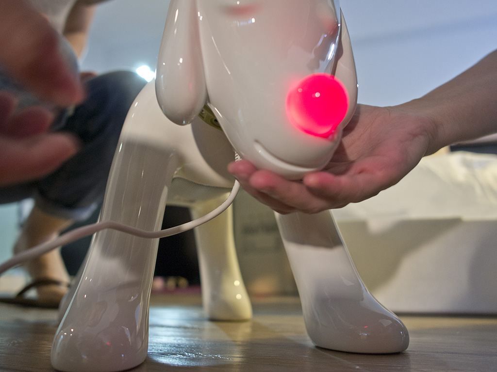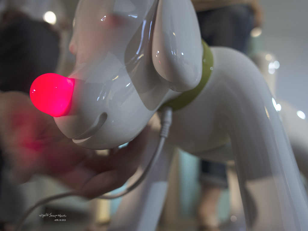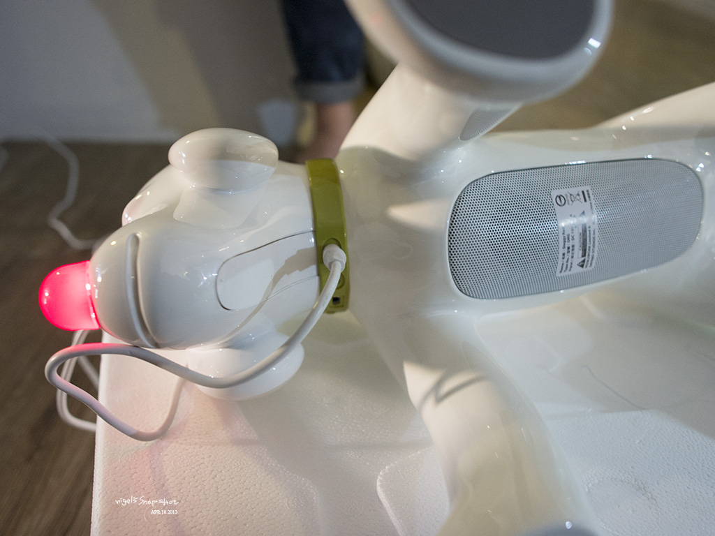 ↑ 項圈上有電源孔跟3.5mm插孔,肚子上的喇叭是yamaha lab蓋過保證的音響來著,狗下巴有設計感應器,能藉由撫摸的動作調整喇叭音量
