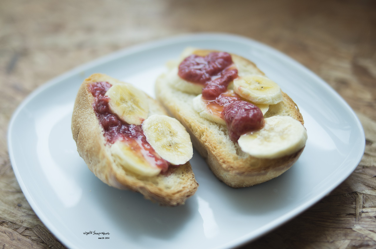 ↑ 切成厚片後烤的微焦非常不賴,加上香蕉切片就更完美了