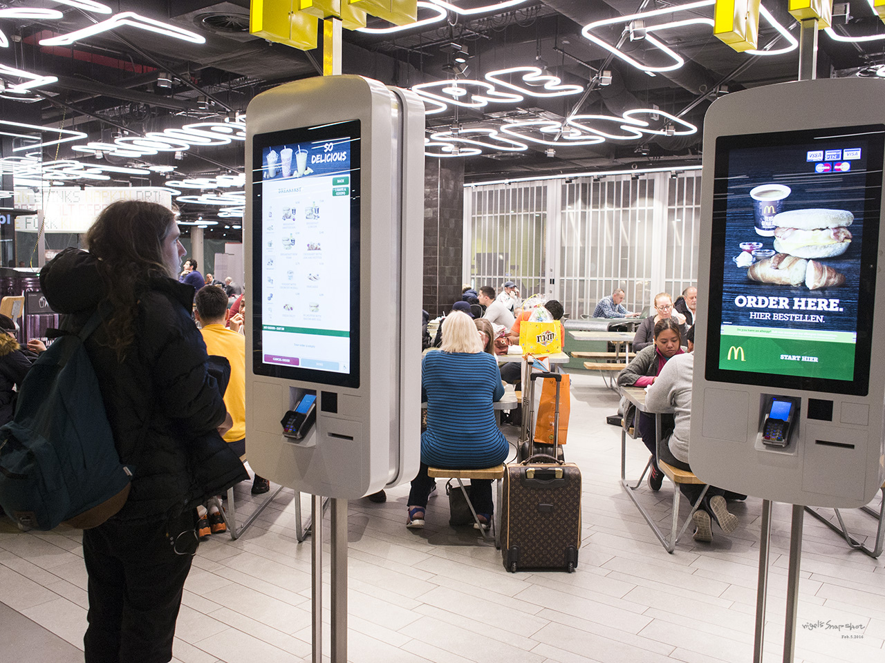 ↑ 飛了十四個小時之後短暫過境荷蘭等待轉機,機場的麥當勞點菜跟結帳系統完全數位化,天花板的各種品牌LOGO很搶眼