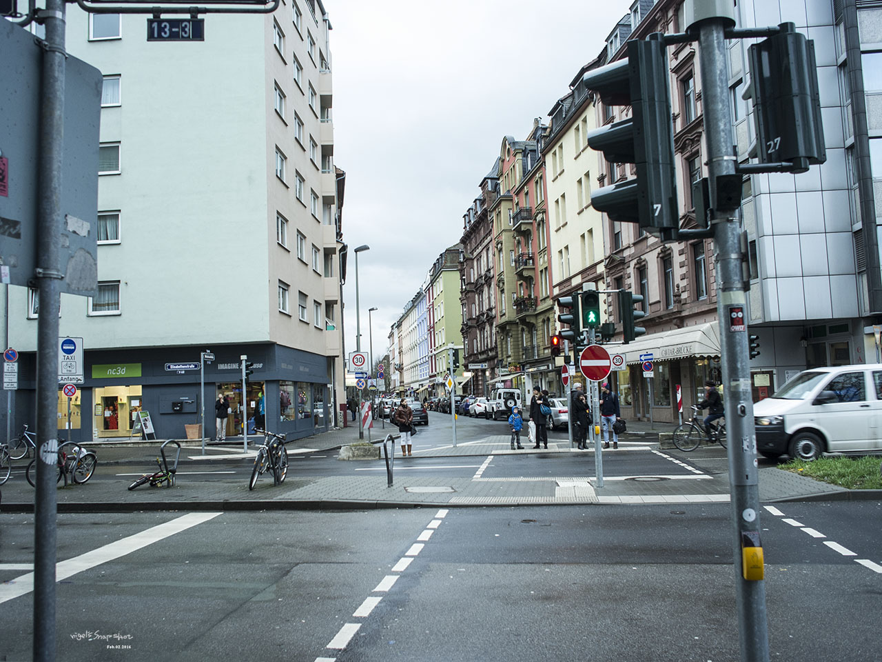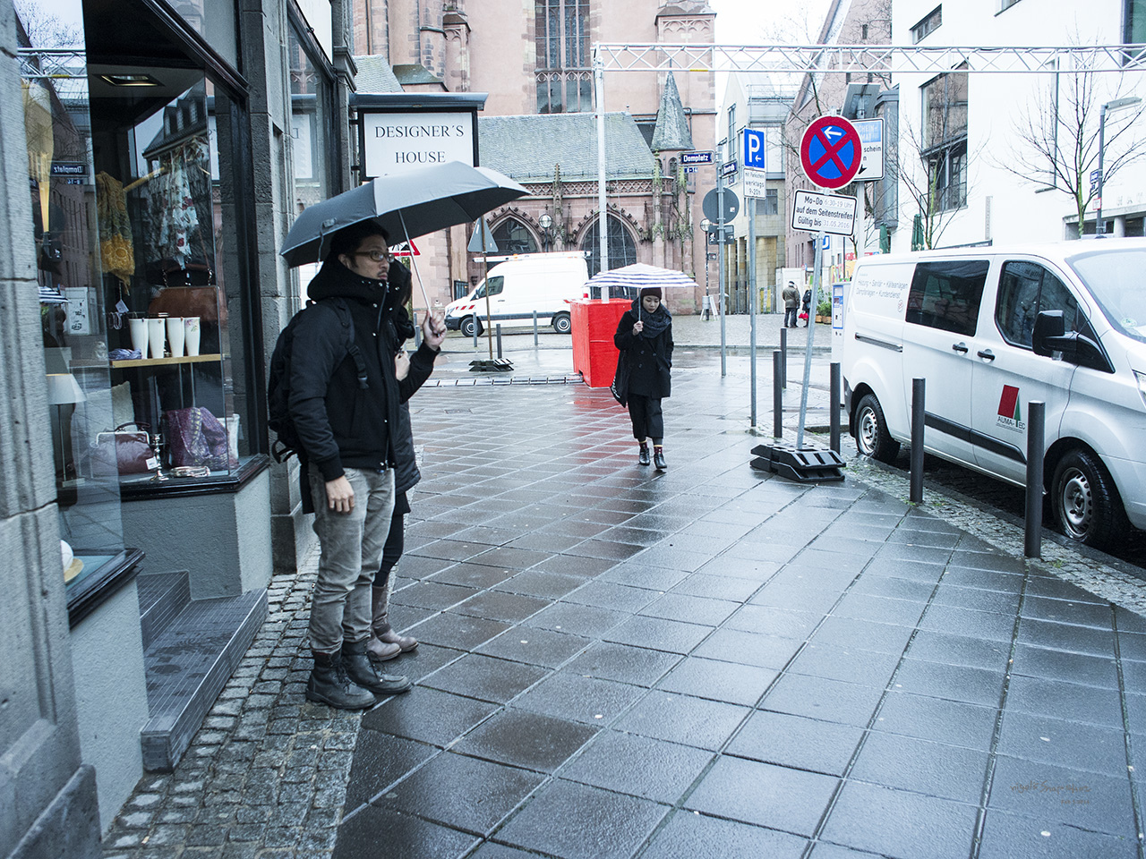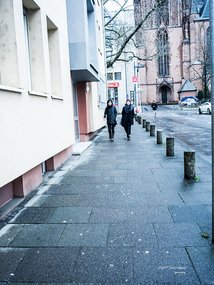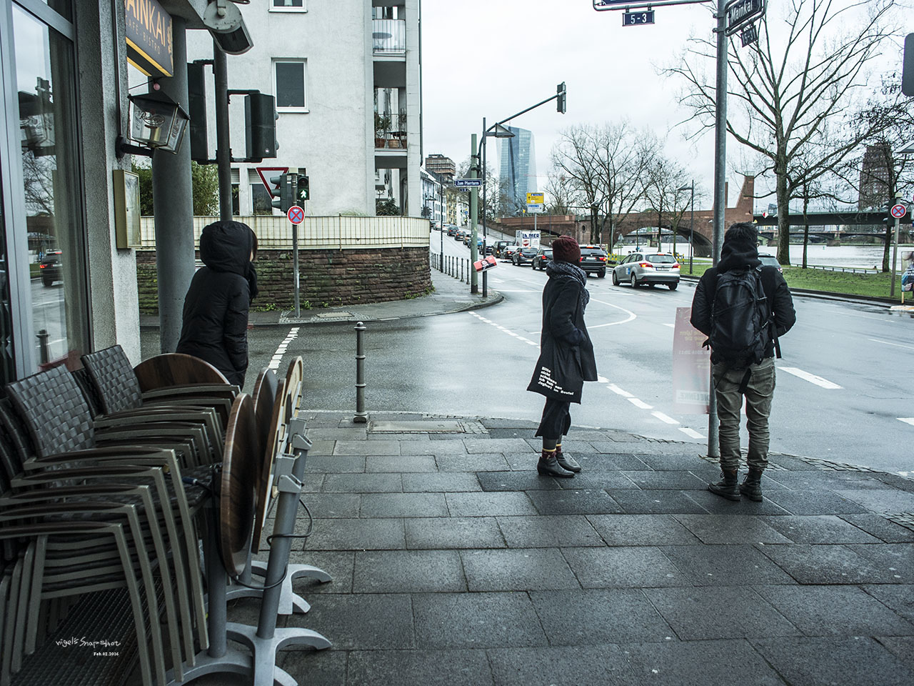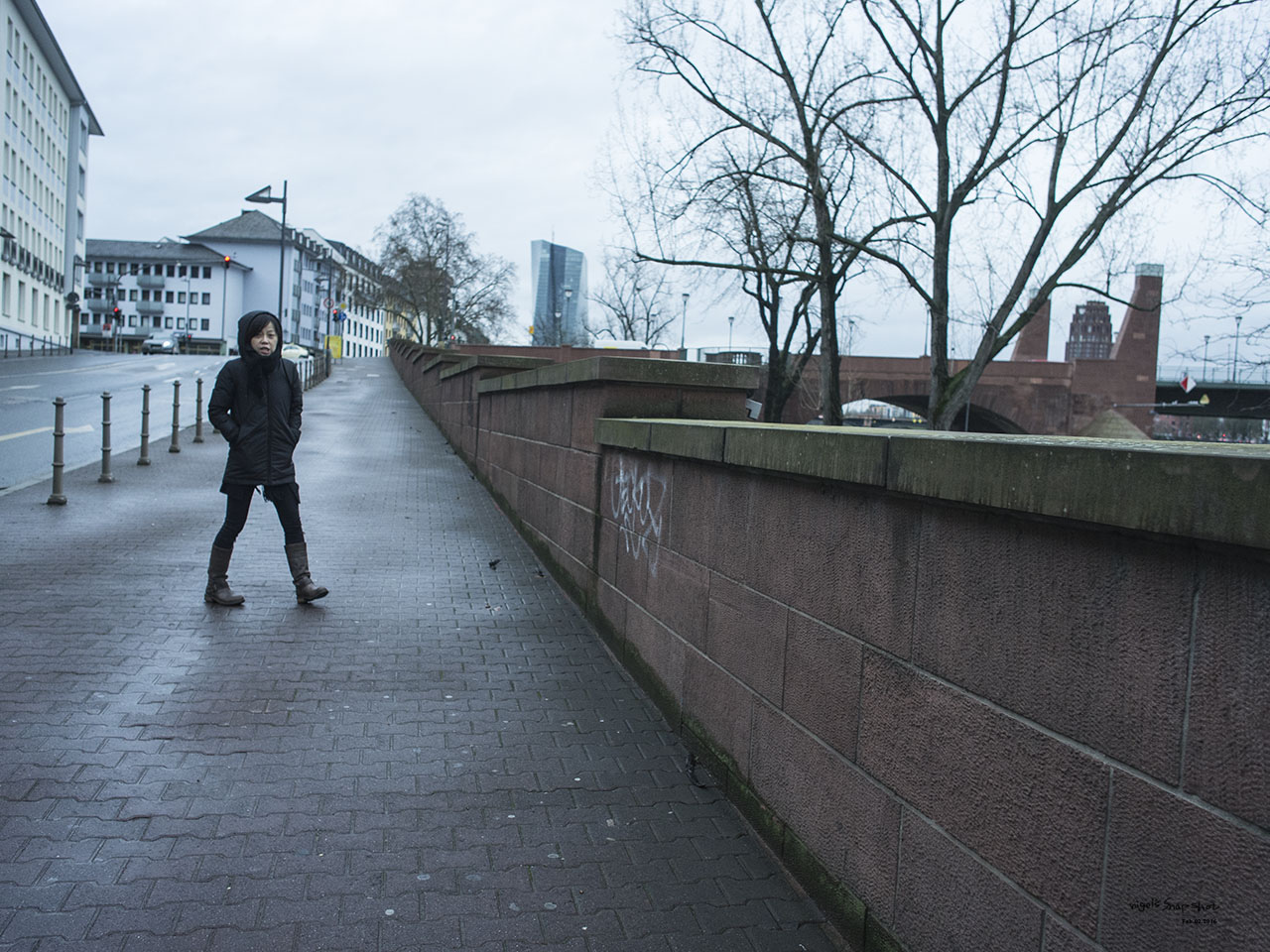 ↑ 在美茵河畔被冷風刮到臉痛,準備步行過橋中