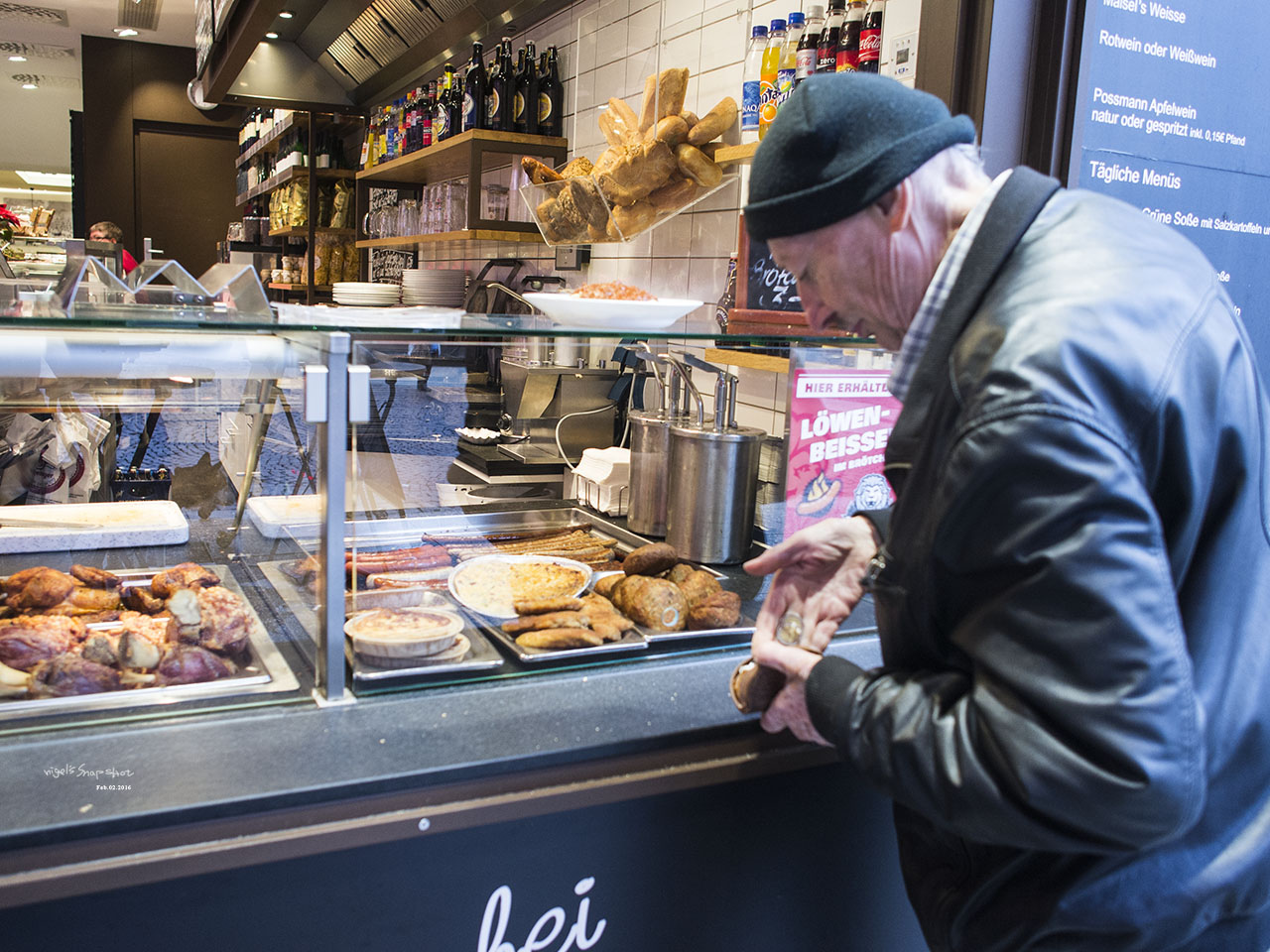 ↑ 老伯伯在路邊的香腸名店等了一盤熱騰騰的義大利麵,害我們看得很羨慕